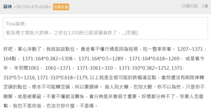 這個王八蛋,應是與金×有心仇之人,會講出“空頭回補”這麼專業術語,絕非一般新手,是誰?大家了然於胸。可惜,兩人共同特徵皆喜賣弄,自以為是,也不容挑戰,大測失準,顏面盪然,就學小孩耍無賴,作怪引人注目,也算可憐之人。唉!