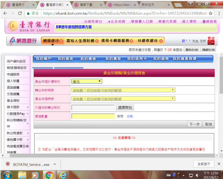 馬上現場操作示範看看就知有無完成→台銀之不同貨幣的勾串~購買黃金。