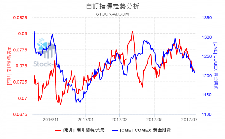 感謝阿雪的繪圖。這圖看得很清楚,南非幣兌美元匯率在今年3月下旬到6月下旬這三個月區間的變化圖形,是複製了2016年11月上旬到2017年3月上旬,這四個月區間的變化圖形而來 (各位可依剛剛剛所說時點,自行畫出矩形區間來對照圖形)。而現階段南非幣兌美元匯率,正與黃金期貨價格呈同步發展,趨勢仍呈現下行走向。雖然昨日上半日,南非幣兌美元匯率曾開始轉為小幅升值,容易讓人以為這波下行已經結束;但在近收盤前這8小時內,南非幣兌美元匯率有急劇的變化,是從升值0.5%幅度轉為反向的貶值0.8%幅度,可見得黃金價格也即將呈現同步急劇的調整轉向。