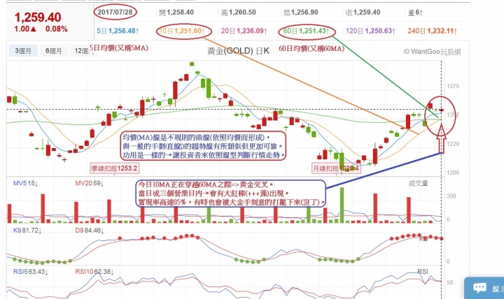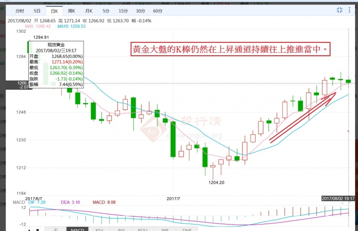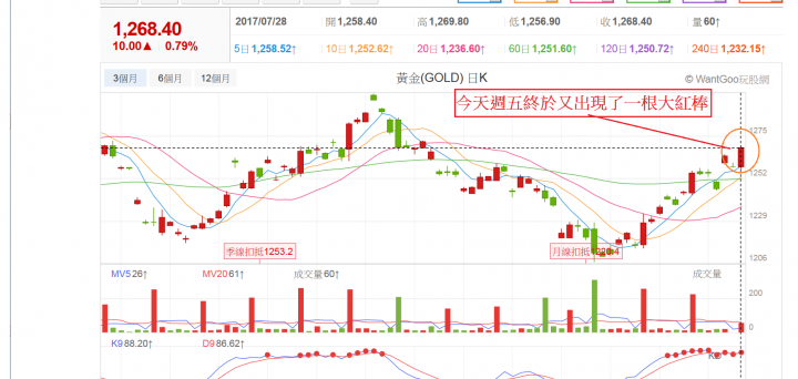 黃金大盤的K棒→以經由綠棒轉為紅色十字棒了。