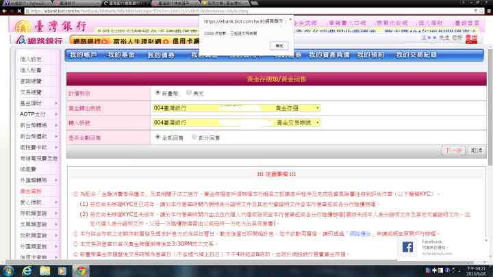 請問一下像現在9/26上午我是不是算盤後交易呀??因為我剛要賣黃金沒辦法賣是不是要等到下午4點過後呀??在這段時間黃金是不是也會漲跌呀?(呵呵黃金存摺菜鳥)