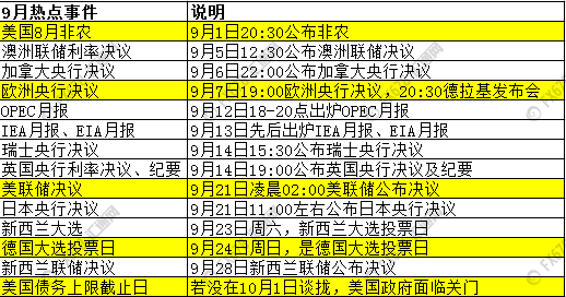 特別提醒:黃色框為9月熱點事件中的重點,此外,9月還需要特別關注朝鮮局勢、特朗普政策及白宮動盪對市場的影響。