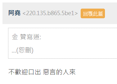 有幾分證據說幾分話,既然是你跟他私下的恩怨我沒興趣知道,但如果你覺得你被詐財了,受騙了,委屈了,大可全都把證據供出來讓大家檢視不必整天勾心鬥角,爾虞我詐,我們也不是在偏袒金讚,就能攤在陽光下的東西先秀出來給大家看如何?若沒有那請閉上你的嘴從此消失⋯⋯因為你說的話不只聽聽看看就好,也毫無可信度!金讚大他不是神不需要被供,若他有著一股神力像sef一樣信徒會越來越多,就算你在怎麼抹黑,重傷,金讚sef自然就會無視你的存在,何來的徒弟幫他排除異己呢?我也不是他的徒弟,只是你的惡言重傷金讚讓我真的看不下去!誰跟誰沒恩怨,誰跟誰沒過節,看你用何種心態面對他並化解他!你這樣的言行真是你老師勒碗公碗盤碗筷都要拿出來問候你了!