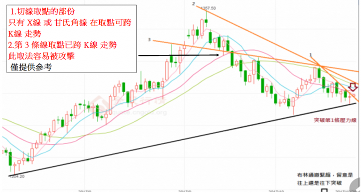 軌道 的原理 : 簡單的說法就是取 另一個均線層 的價格點甘氏角