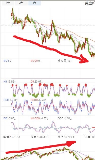 如下圖...  為何2014-2015年間 金價一路下滑, 而加權指數卻一路上升呢?