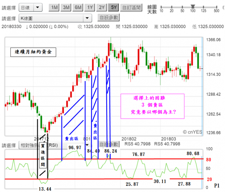 1. 圖一(RSI 參數為 5):買進區沒問題,但 3 個賣出區究竟要選哪個賣出區~產生選擇賣出點的困難