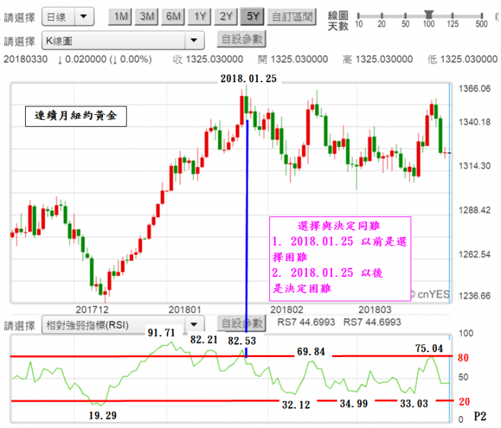 2. 圖二(RSI 參數為 7):2018.01.25 以前產生賣點選擇困難,2018.01.25 以後產生買進決定困難~產生選擇賣出與決定買進同難