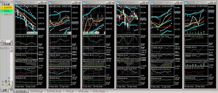 如今幾乎已固定 在MT4介面中 留下3條均線 + 布林帶 + sar 和 6個震盪指標.