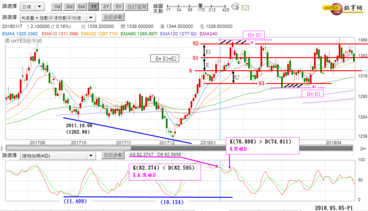 若無前一日的K值與D值,可以分別用50來代入計算,經過長期的平滑的結果,起算基期雖然不同,但會趨於一致,差異很小。 所以 RSV 是 單位期間價格變化 K 值 已從 單位期間變化 轉成 期間價格變化對移動平均 的概念 D 值 再轉成 移動平均 對 移動平均 的概念 所附圖是 SAR+布林通道 ~ 這樣會看不到 單位期間變化移動平均 的關連 及 變化 2. ....... MACD柱線c值高於a值 應算是底背離, 但不知它有無效力 ? 另外, D點(最低)和A點不同日, E點(最低)和C點不同日 ....... |