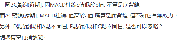 而AC藍線(遠期], MACD柱線c值高於a值 應算是底背離, 但不知它有無效力 ?