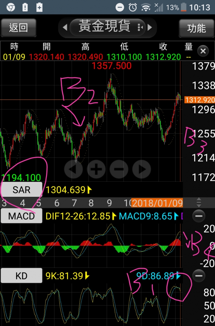 用SAR、MACD、KD指標從三項指標來觀察SAR:這禮拜未能突破1320,B1壓力點點將會出現,下壓回測MACD:12/19開始翻紅向上攀升至1/4最高1325.956未來觀察需突破此價,不然將慢慢向下縮KD:目前KD值皆來到了80↑處於過高,很大機率會向下修正,建議投資人KD值來到25↓慢慢來佈局