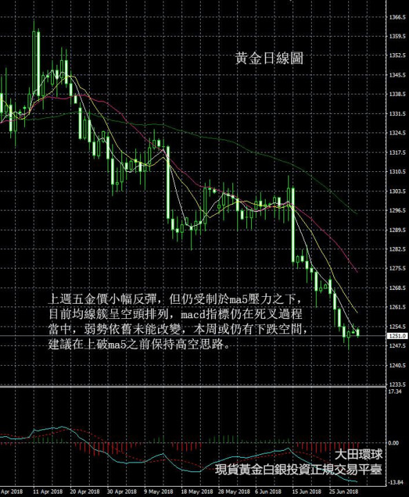 從現貨黃金日線圖看,上週五金價小幅反彈,但仍受制於ma5壓力之下,目前均線簇呈空頭排列,macd指標仍在死叉過程當中,弱勢依舊未能改變,本周或仍有下跌空間,建議在上破ma5之前保持高空思路。
