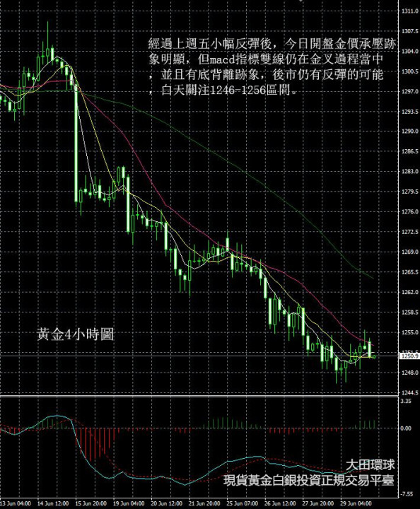 從現貨黃金4小時圖看,經過上週五小幅反彈後,今日開盤金價承壓跡象明顯,但macd指標雙線仍在金叉過程當中,並且有底背離跡象,後市仍有反彈的可能,白天關注1246-1256區間。