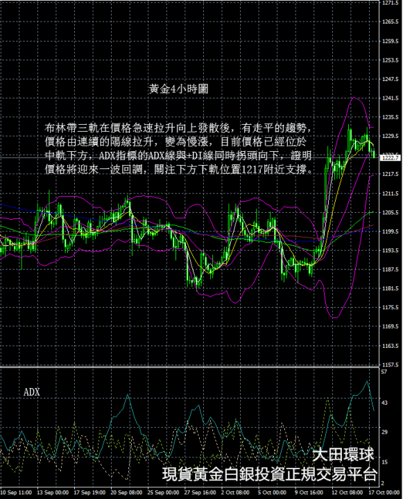 從現貨黃金4小時圖看,布林帶三軌在價格急速拉升向上發散後,有走平的趨勢,價格由連續的陽線拉升,變為慢漲,目前價格已經位於中軌下方,ADX指標的ADX線與+DI線同時拐頭向下,證明價格將迎來一波回檔,關注下方下軌位置1217附近支撐。