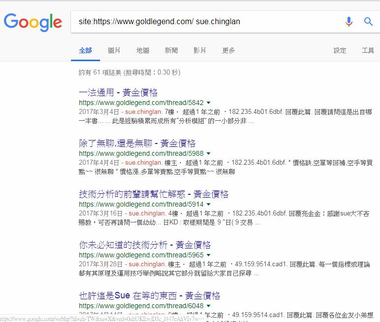 我只簡單舉語法1例 (搜尋sue所有文章) : site:https://www.goldlegend.com/ sue.chinglan