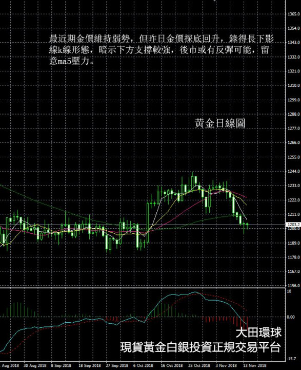 從現貨黃金日線圖看,最近期金價維持弱勢,但昨日金價探底回升,錄得長下影線k線形態,暗示下方支撐較強,後市或有反彈可能,留意ma5壓力。