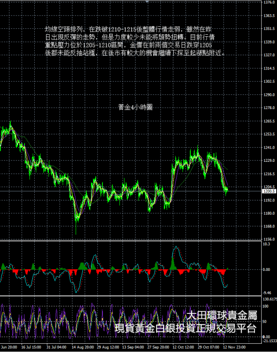 從現貨黃金4小時圖看,均線空頭排列,在跌破1210-1215後整體行情走弱,雖然在昨日出現反彈的走勢,但是力度較少未能將頹勢扭轉。目前行情重點壓力位於1205-1210區間,金價在前兩個交易日跌穿1205後都未能反抽站穩,在後市有較大的機會繼續下探至起漲點附近。