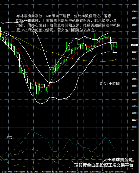 從現貨黃金4小時圖看,布林帶橫向發散,ADX線向下運行,位於30數值附近,兩條DI線互相纏繞,目前價格正處於中軌位置附近,暗示多空力量均衡,價格在碰到下軌位置後開始反彈,後續需繼續關注中軌位置1225附近的壓力情況,若突破則順勢做多為宜。