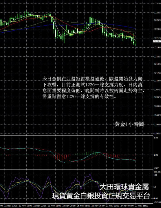 從現貨黃金1小時圖看,今日金價在亞盤短暫橫盤過後,歐盤開始發力向下攻擊,目前正測試1220一線支撐力度,日內消息面重要程度偏低,晚間料將以技術面走勢為主,需重點留意1220一線支撐的有效性。