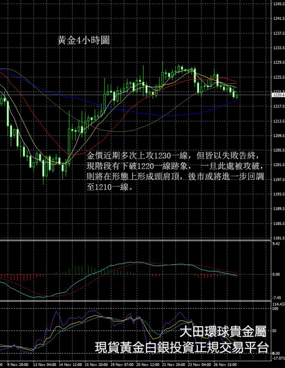 從現貨黃金4小時圖看,金價近期多次上攻1230一線,但皆以失敗告終,現階段有下破1220一線跡象, 一旦此處被攻破,則將在形態上形成頭肩頂,後市或將進一步回調至1210一線。