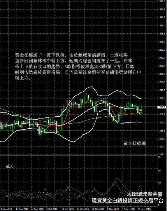 從現貨黃金日線圖看,黃金在經過了一波下跌後,由於鮑威爾的講話,日線收陽重新回到布林帶中軌上方,短期均線也糾纏在了一起,布林帶上下軌有收口的趨勢,ADX指標依然處於30數值下方,日線級別依然處於震盪格局,日內需關注金價能否延續漲勢站穩在中軌上方。