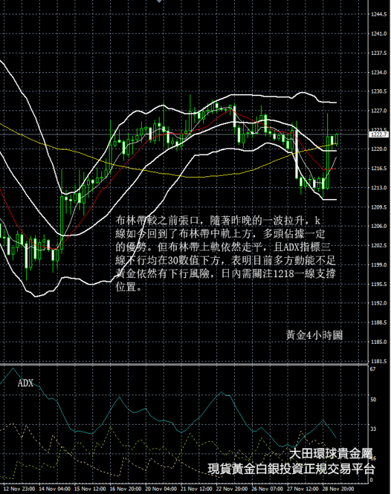 從現貨黃金4小時圖看,布林帶較之前張口,隨著昨晚的一波拉升,k線如今回到了布林帶中軌上方,多頭佔據一定的優勢。但布林帶上軌依然走平,且ADX指標三線下行均在30數值下方,表明目前多方動能不足,黃金依然有下行風險,日內需關注1218一線支撐位置。