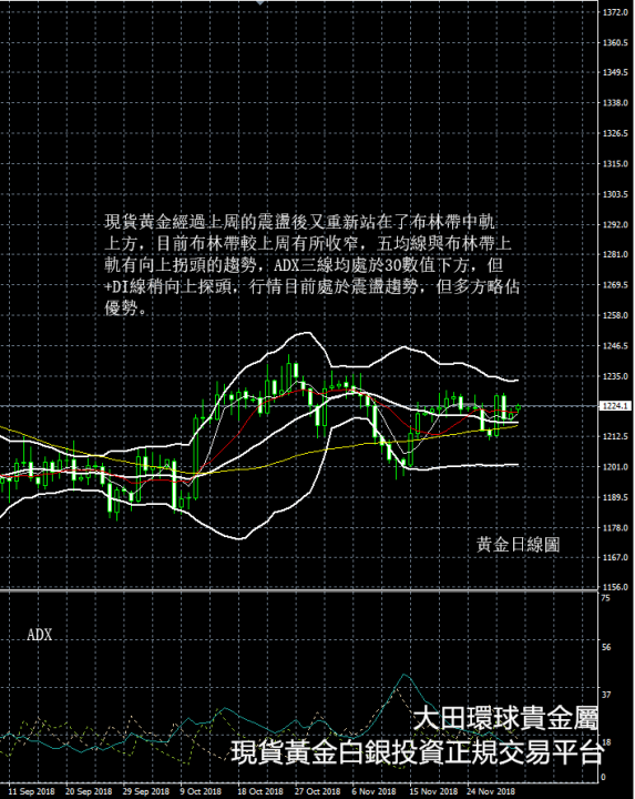 從現貨黃金日線圖看,現貨黃金經過上周的震盪後又重新站在了布林帶中軌上方,目前布林帶較上周有所收窄,五均線與布林帶上軌有向上拐頭的趨勢,ADX三線均處於30數值下方,但+DI線稍向上探頭,行情目前處於震盪趨勢,但多方略佔優勢。