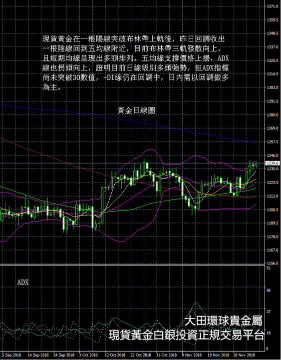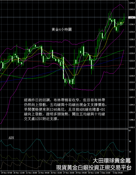 從現貨黃金4小時圖看,經過昨日的回檔,布林帶稍有收窄,但目前布林帶仍然向上發散,五均線與十均線出現金叉支撐價格,早間價格便來到1240高位,且目前ADX線也隨著+DI線向上發散,證明多頭強勢,關注五均線與十均線交叉處1237附近支撐。完整走勢圖分析可點擊閱讀原文
