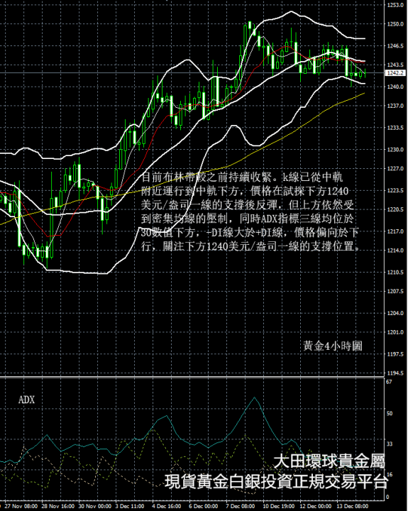 從現貨黃金4小時圖看,目前布林帶較之前持續收緊。k線已從中軌附近運行到中軌下方,價格在試探下方1240美元/盎司一線的支撐後反彈,但上方依然受到密集均線的壓制,同時ADX指標三線均位於30數值下方,-DI線大於+DI線,價格偏向於下行,關注下方1240美元/盎司一線的支撐位置。