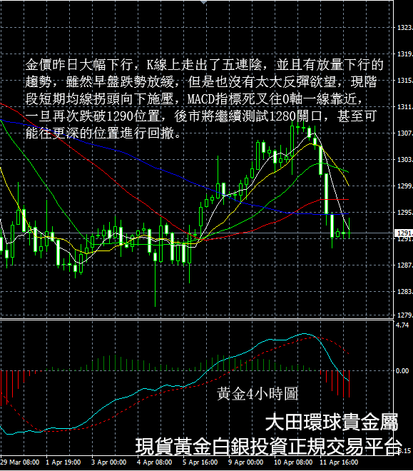從現貨黃金4小時圖看,金價昨日大幅下行,K線上走出了五連陰,並且有放量下行的趨勢,雖然早盤跌勢放緩,但是也沒有太大反彈欲望,現階段短期均線拐頭向下施壓,MACD指標死叉往0軸一線靠近,一旦再次跌破1290位置,後市將繼續測試1280關口,甚至可能往更深的位置進行回撤。