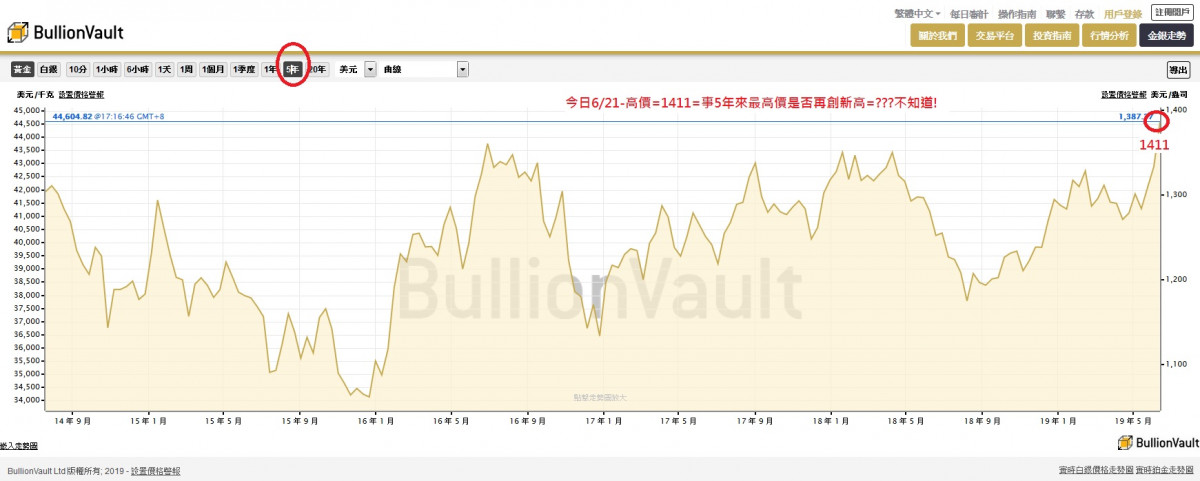 應該要大回檔了吧,上次金價大噴發不少中國大媽住進套房等了幾年好不容易攀上1400終於能退租套房,雖然現今一堆專家喊能漲破天際自己還是不敢買怕住套房,這波漲得太狂暴個人認為2019年合理的黃金漲幅價位應在1250~1330/1盎司區間才正常,所以除了在1392時賣了幾塊121x~125x時購入的王鼎金條外台銀黃摺還是暫時保持觀望中如7月底前還是繼續盤在1400上下今年應該就不會將資金投入黃金這塊了待來年再伺機入場吧。