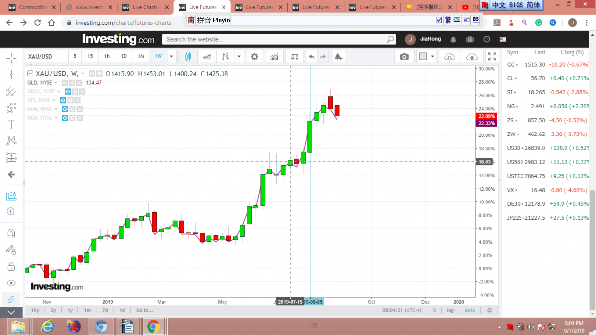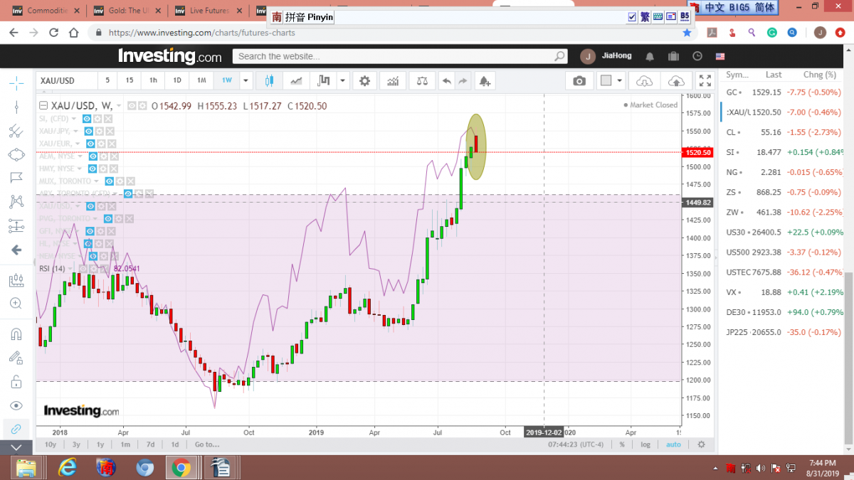 最近的黃金市場也出現了烏雲蓋 (見下圖,黃金現貨週線)。雖說這一陣子黃金市場受新聞影響極大,瞬息千變萬化,但留個意也不是壞事。