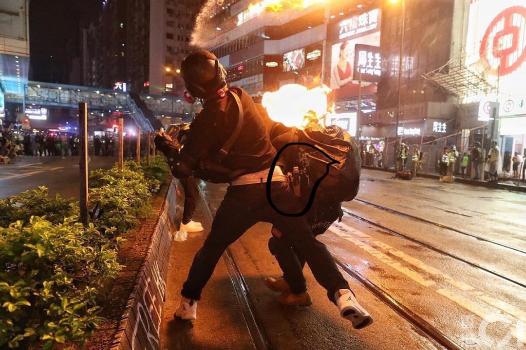 警察投擲燃燒彈要栽贓給示威群眾,在滿是媒體的鏡頭前深怕別人不知道他是警察,直接將槍插在腰帶的槍套上投擲燃燒彈? 如果真是警察偽裝只能說這名警察智商明顯不足,連自己的小命也不要了,而香港警方的勤前教育也很失敗,連配槍也不取下,正大光明把槍插在槍套就要員警拿著燃燒彈直接往前衝.......可能嗎?