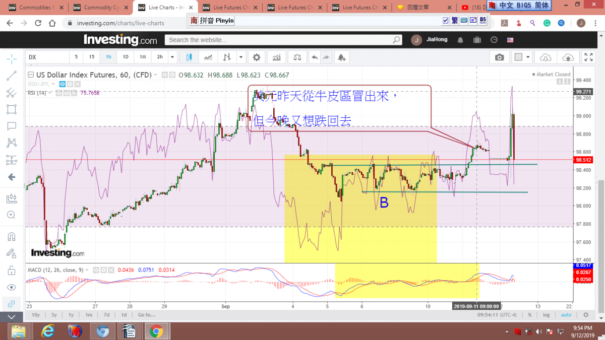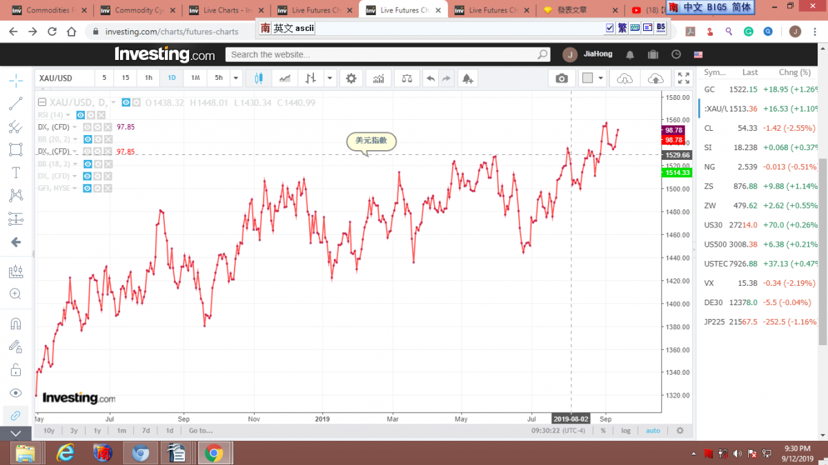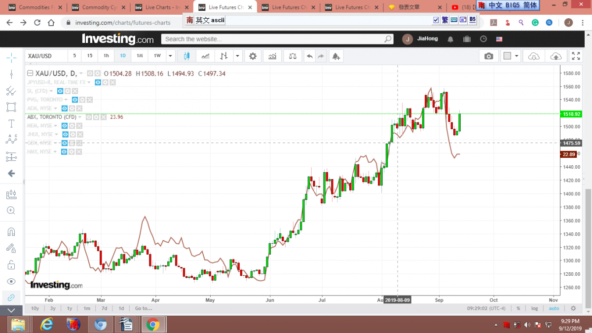 我昨天在[觀戰記 9/11/2019] 貼了一張 300-min 黃金期貨圖,認為 ”圖中粉框黃金期貨是修正波ABC,C波後的小黃框是impulse wave 的濫觴(參考指標已轉上,陰陽線也碰Bollinger Bands的下沿)。“