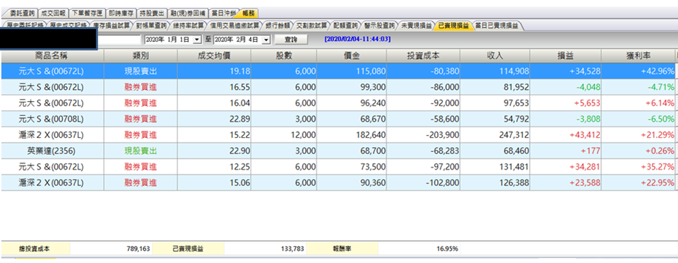 3.對帳單的二、三筆分別是1月9,10日的交易,實情是我在轉換現金,降低曝險的部位。如果留到現在,又多賺個48000元,不過事實是沒人能在最低點回補,所以我選擇分段獲利