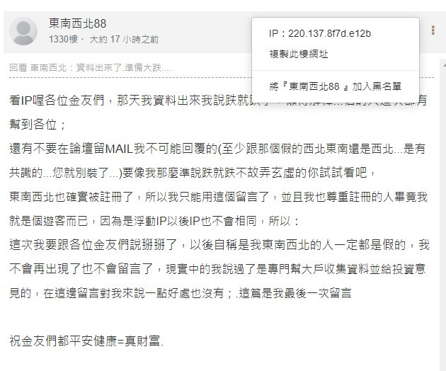 這次我要跟各位金友們說掰掰了,以後自稱是我東南西北的人一定都是假的,我不會再出現了也不會留言了,現實中的我說過了是專門幫大戶收集資料並給投資意見的,在這邊留言對我來說一點好處也沒有;.這篇是我最後一次留言