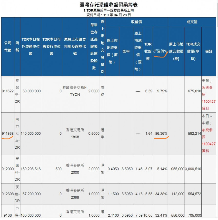 我只想提醒還抱著同方的朋友..小心這種DR股的「大幅溢價」..