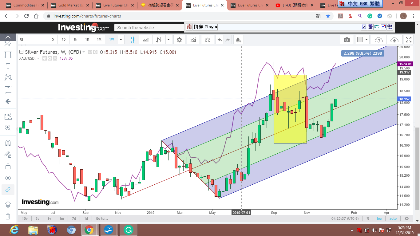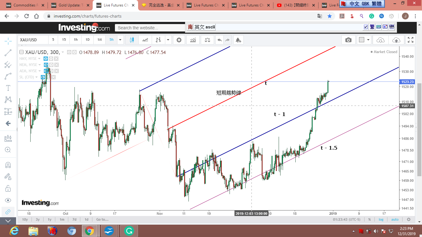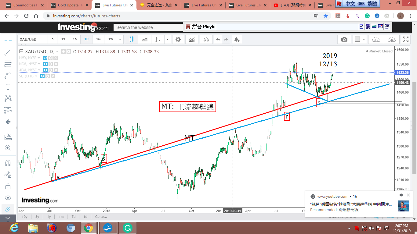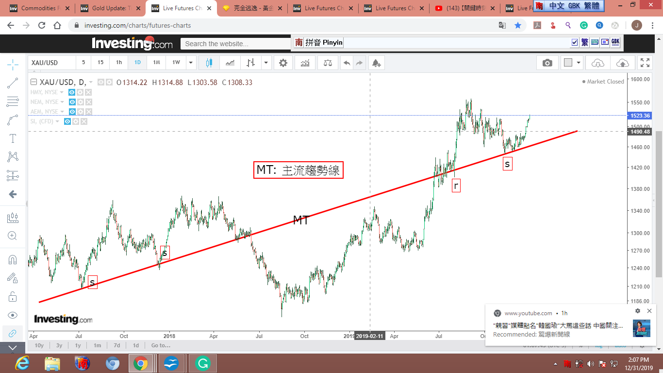 我看金價,靠的是趨勢線,抓住趨勢線,就可以看清全盤。下圖是金現(XAU)的日線,從2018八月到2019十二月,紅線是我認出來得中期趨勢線。各位可以看到它有時是支撐線,有時是抵抗線。最近的支撐是2019-11-12.