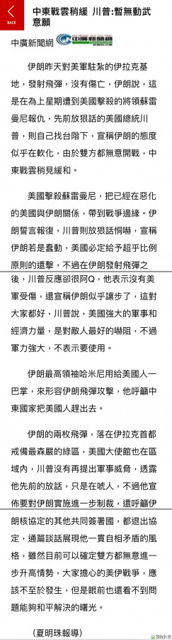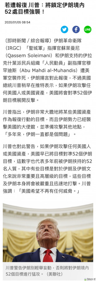 伊朗並在5日宣布,不再遵守2015年核協議對鈾濃縮作業的限制。川普2018年5月以這項核協議「內容糟糕」、「愚蠢荒唐」為由,片面宣布退出,並逐步恢復對伊朗的石油禁運等嚴厲制裁,想逼迫伊朗重談新協議。然而,一年多來,美伊緊張情勢不斷升高,川普想要限制伊朗發展核武和飛彈的目標似乎愈來愈難達成。