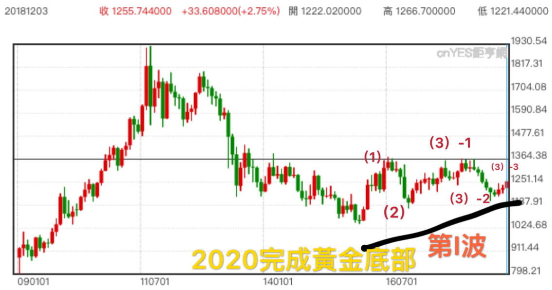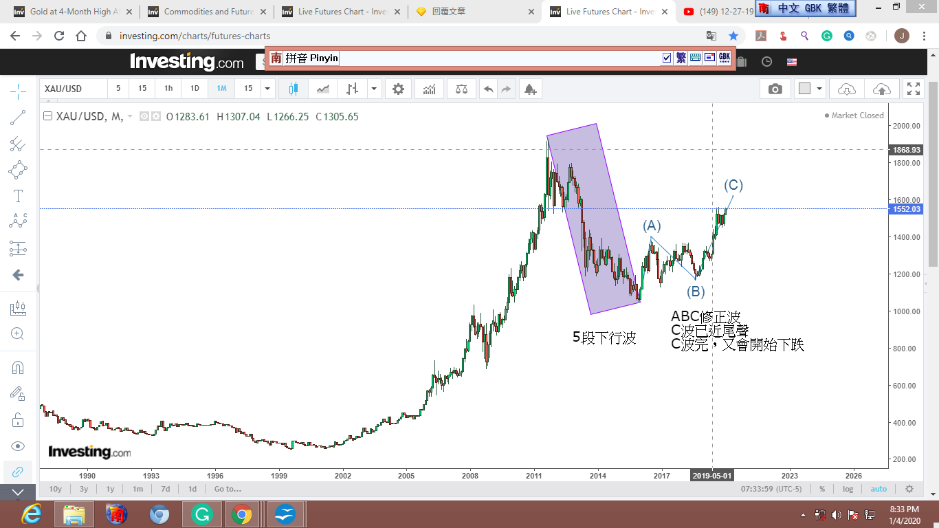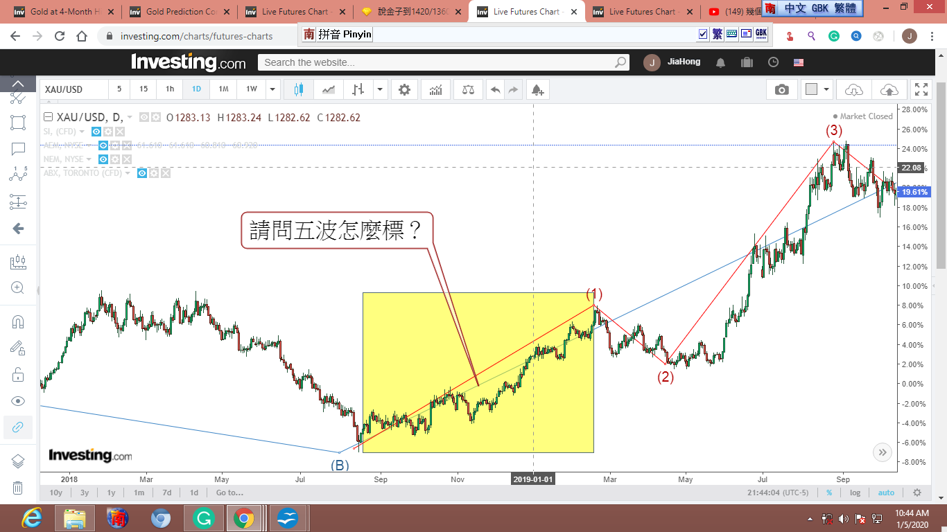 金子從2015年年底走到現在,有許多人認為是ABC修正波,但我持保留態度,主要是波段有些地方不合比率原則。就拿C的第一波來說吧,我怎麼數也數不出五波來!