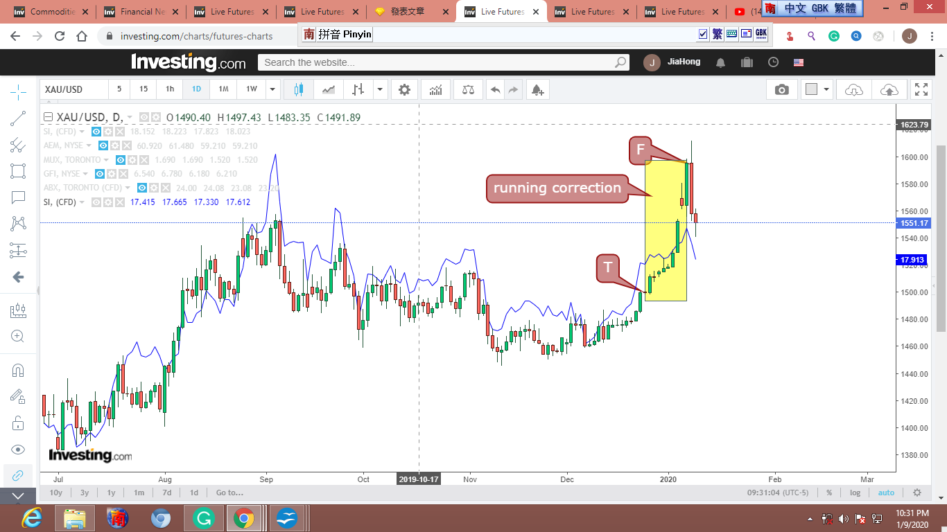 容我解說我的錯誤。金子這一陣子表現強勁,我沒看出它的running correction,直到剛剛和銀子一比對,才發現犯了滔天大錯。下圖解釋我的錯誤: