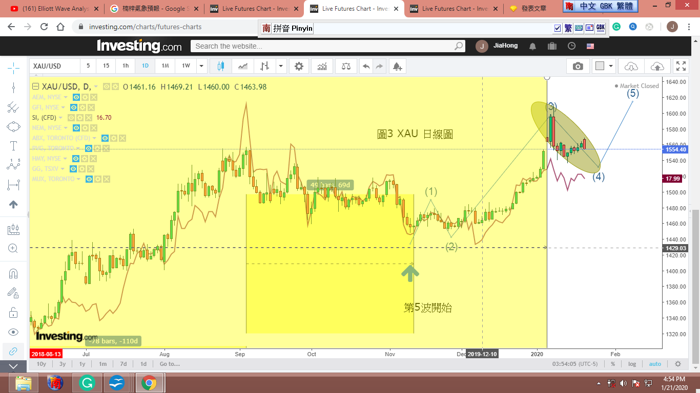 圖 2是 XAU 2018-8-13 以來的週線。如果你是古典的波浪理論者,你應該可以高枕無憂,這張圖分明是從教科書上截圖而來,五個波段清晰可數。我不是12345-ABC的信仰者,但我可以睜一隻眼,閉一隻眼,勉強接受。[美中不足的是第一波略嫌零亂破碎。]