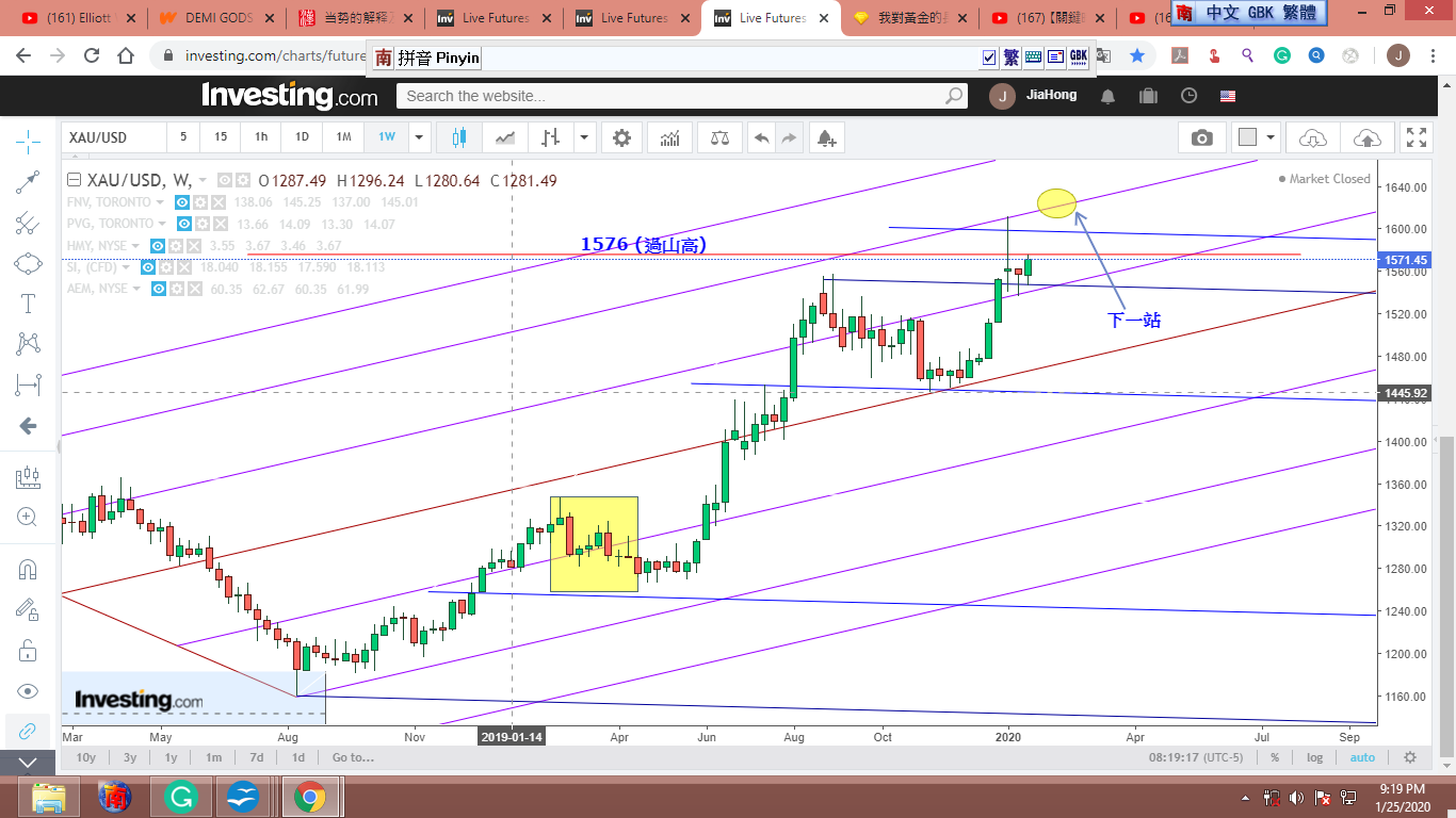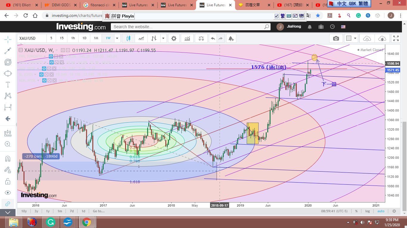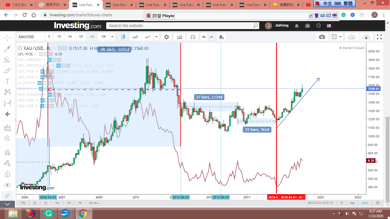 在論壇上,我一說再說:黃金長期看好。這是我根據上升下降波段的時間比,將月線圖切割成波段得來的結論。 (見 圖1)。[其實,只要世間有通膨,說黃金長期看好,就錯不。呵呵。]
