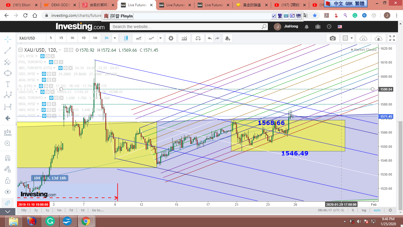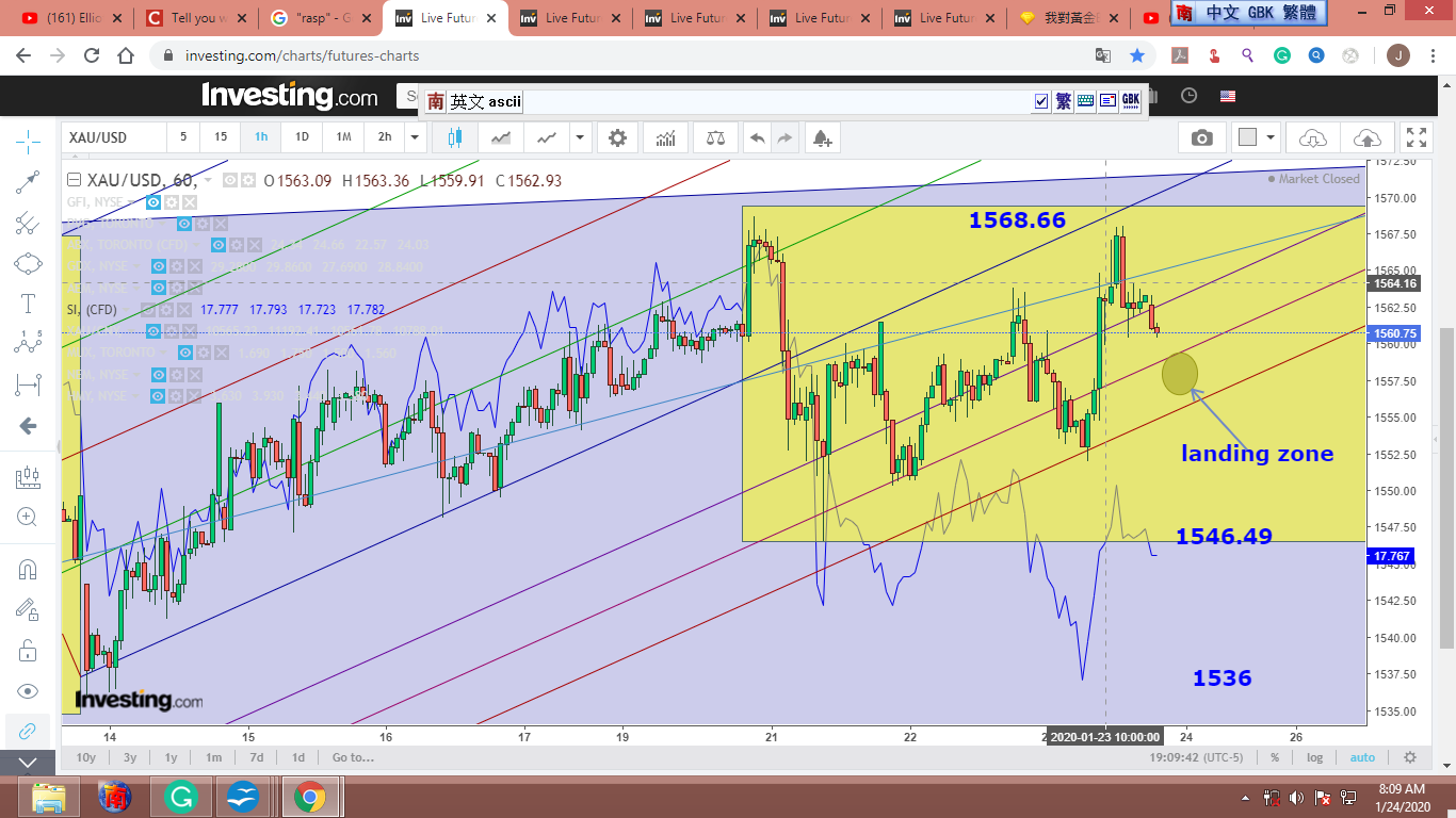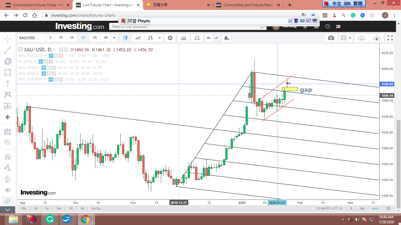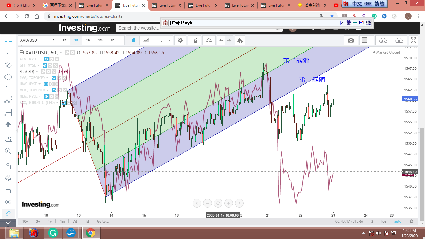 在論壇上,我一說再說:黃金長期看好。這是我根據上升下降波段的時間比,將月線圖切割成波段得來的結論。 (見 圖1)。[其實,只要世間有通膨,說黃金長期看好,就錯不。呵呵。]