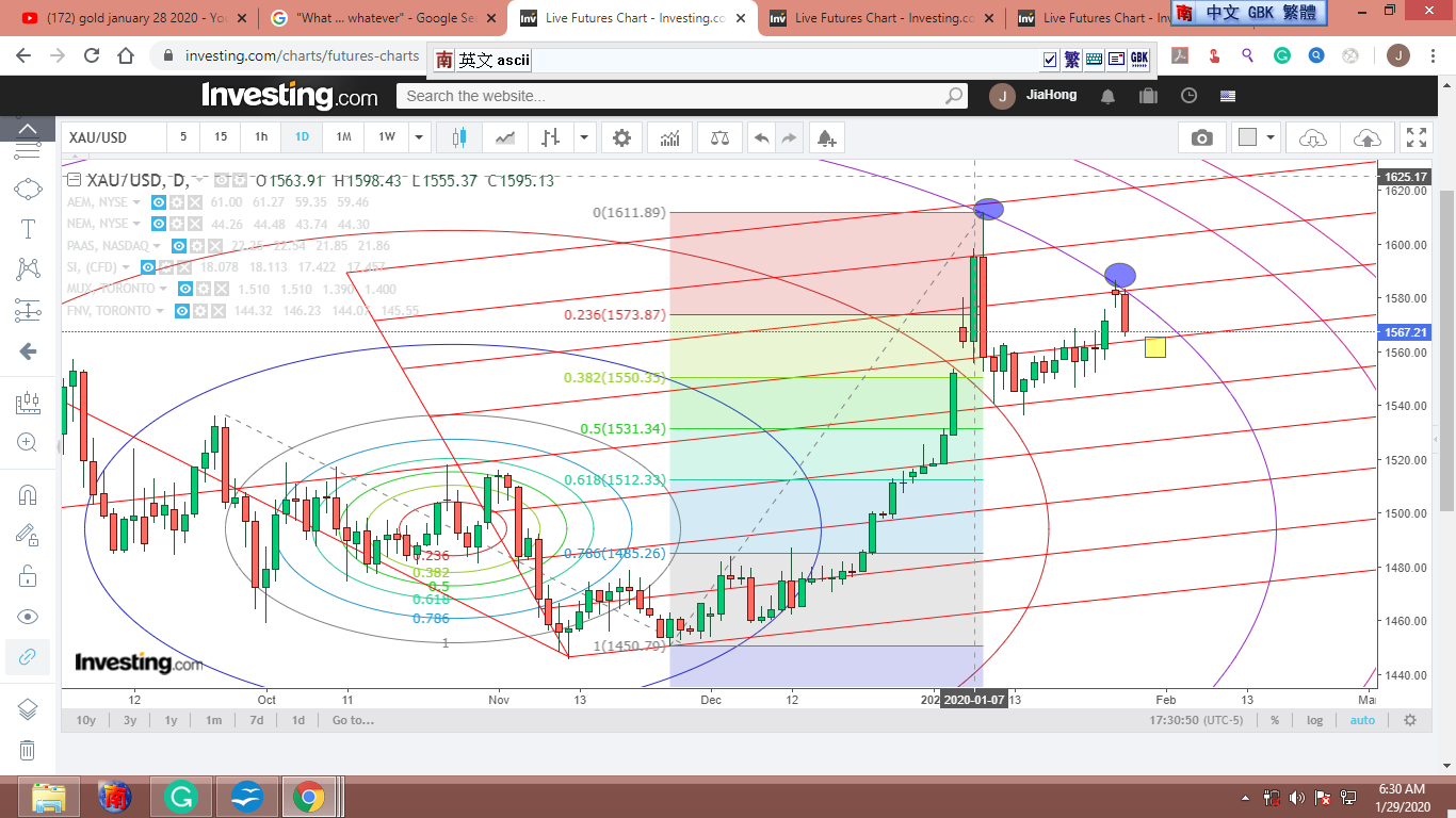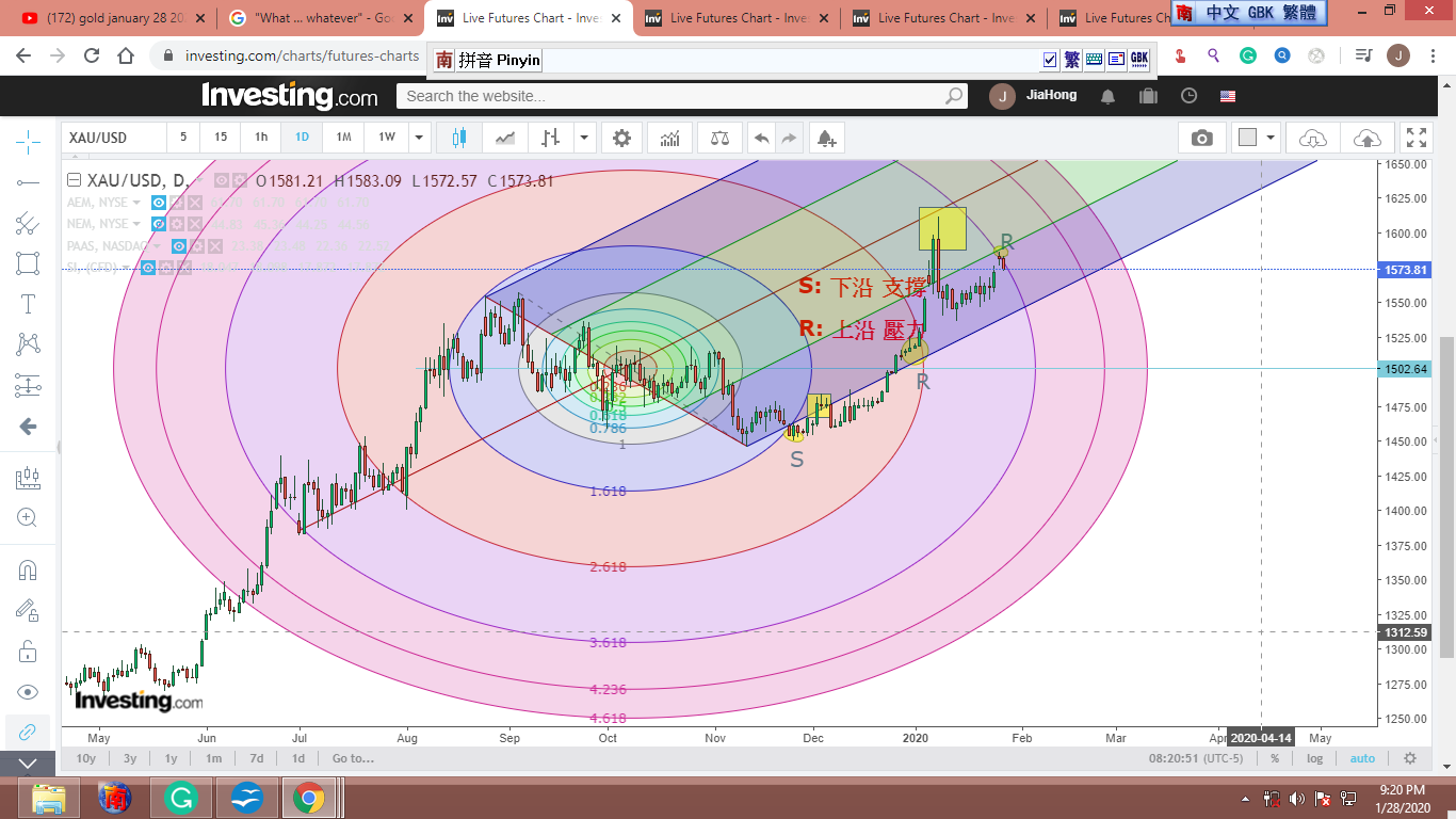 我常將費氏圓和安朱叉并用,有時看的更清楚。參看第二圖。我得到的是兩處黃框框的轉折點。
