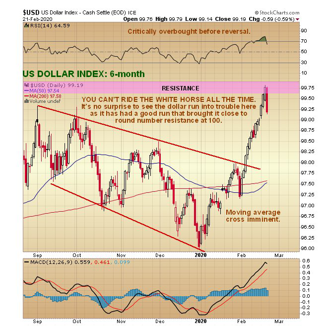美元和黃金一向走相反路,美元升則黃金跌,反之亦然。本月(2020年2月)兩者同步上揚,引人注目。這其實不難了解:美元和黃金都是避風港,危機來臨時,兩者的需求都增加。這個月來,美元一帆風順,漲個不停。但是花無百日紅,週五(2月21日)突遇阻力,掉頭下墜,金子因而受益,更加上揚。美金週五反轉的原因很簡單 -- 美元指數到達了100,這是個“整數魔咒”。下面是張美元指數的6年圖,我們可以看到,2015年美元就在這裡吃了兩次閉門羹。但是,這關卡不是攻不破的城堡,圖中MACD似乎已經出現了動能突破,美元不會長期受阻止於此。儘管美聯儲采取揮霍無度的量化寬鬆措施,美元仍然升值,主要原因是全球危機加深,許多以美元計價的債務持有人都在爭先恐後,要搶在美元還沒有進一步飆升前,償還這些債務,這當然更增加美元的需求,預言自我實現,但是大家已經看到,美元的上漲阻止不住黃金。