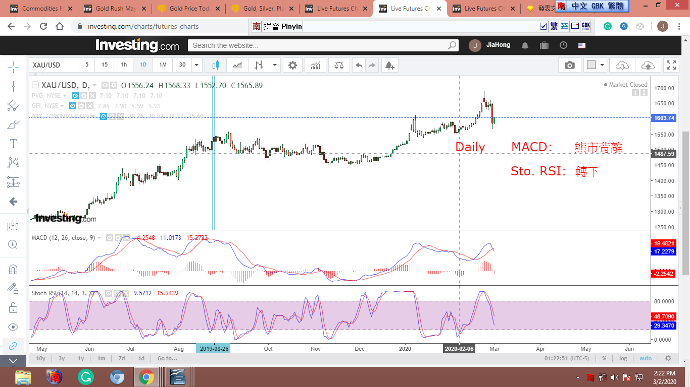 看了XAU 30分鐘,60分鐘和日線的兩個技術指標 (MACD 和 Stochastic RSI)。
