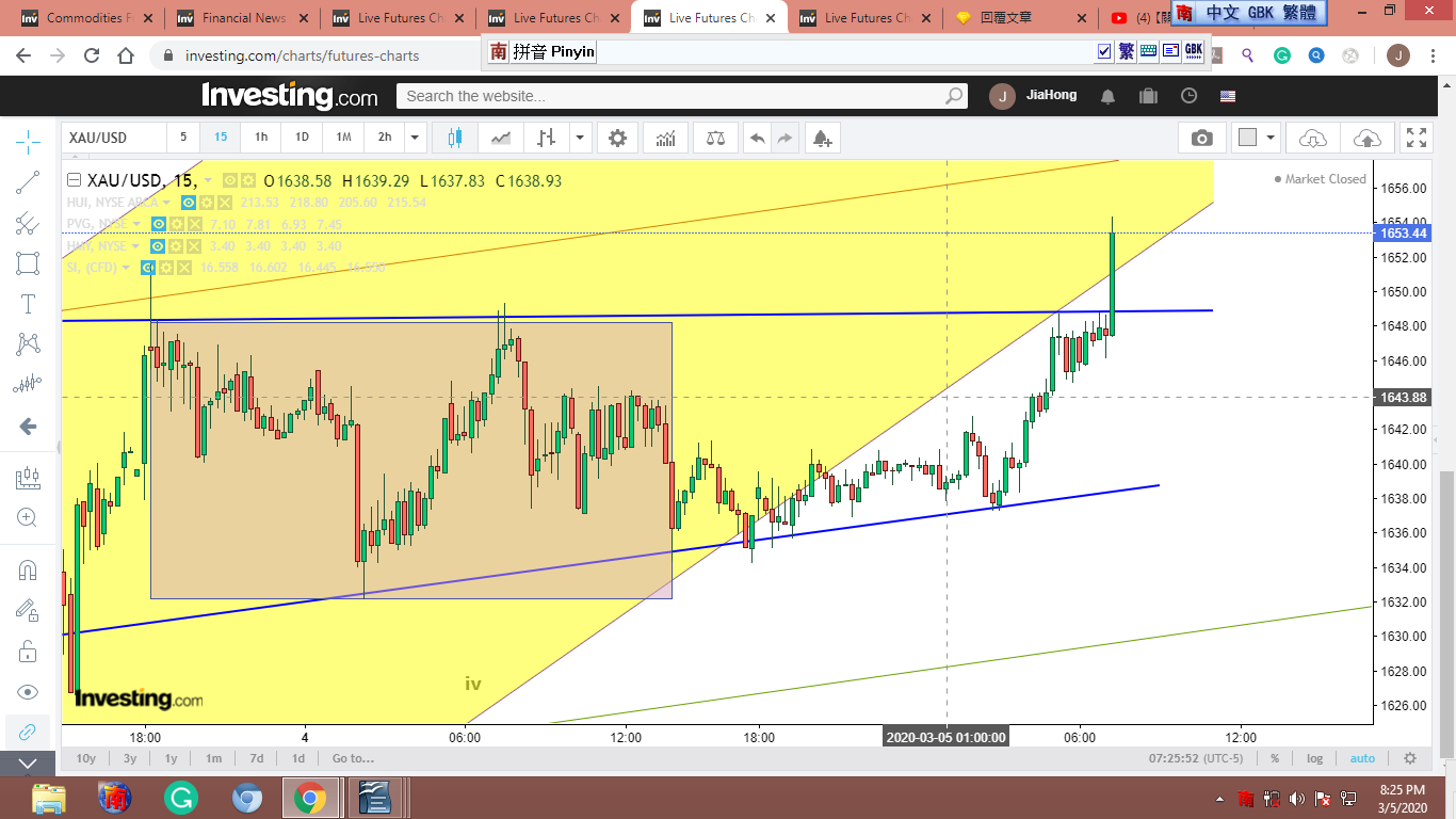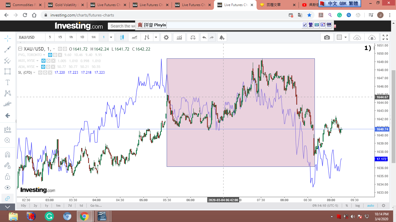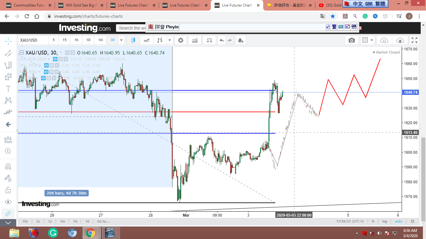 黃框框是美股開盤前,我“幻想”金子的徘徊路線。