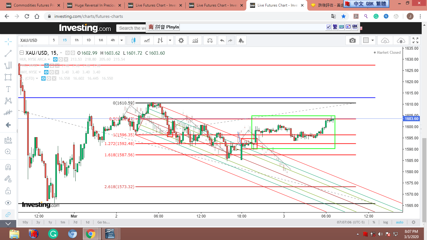 [黃框框是美股開盤前,我“幻想”金子的徘徊路線。]